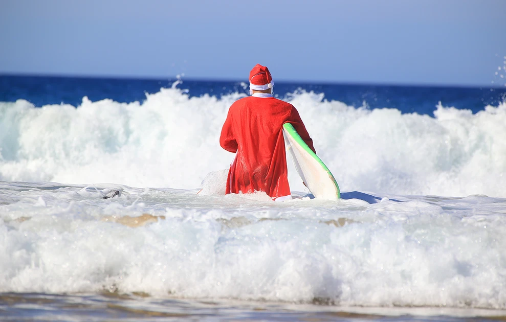 Εκεί, ανάμεσα στους σέρφερ, μπορεί κανείς να εντοπίσει μια εμβληματική φιγούρα: τον Σέρφερ Άγιο Βασίλη. Ντόπιοι ντυμένοι με κόκκινες στολές και λευκές γενειάδες καβαλούν τα κύματα στις παραλίες του Μανχάταν, της Χερμόσα, του Μαλιμπού ή της Σάντα Μόνικα, προσφέροντας ένα θέαμα που συνδυάζει τη γιορτινή διάθεση με το χαλαρό πνεύμα της Καλιφόρνιας.